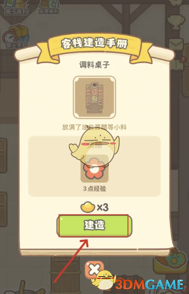 2、之后可以打开客栈建造手册,找到装油盐酱醋小料的桌子,在下方点击建造按钮。