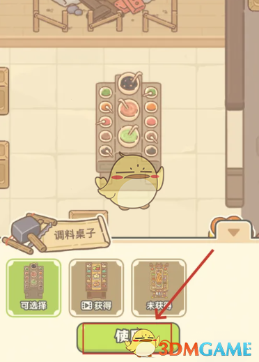 3、进入到调料桌子的建造页码,使用3个元宝即可完成建造,之后点击使用即可。
