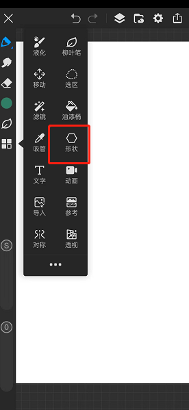1、打开画世界pro软件,进入到绘画的界面,点击左侧菜单栏中的的小菜单,找到并点击【形状】,如图所示: