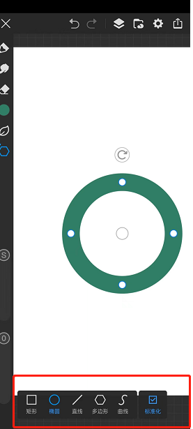 2、在下方会多出一个小窗口,里面有很多图形可以选择,不仅可以画圆,还能画矩形、直线、多边形和曲线,我们点击椭圆,然后在画布上就能绘制圆形了,如果想要正圆,点一下【标准化】即可,如图所示:
